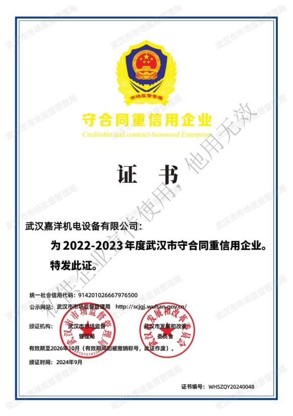 根據(jù)《湖北省合同監(jiān)督條例》《湖北省企業(yè)合同信用狀況公布暫行辦法》相關(guān)規(guī)定,省市場(chǎng)監(jiān)管局組織開(kāi)展了湖北省第十七屆(2022—2023年度)“守合同重信用”企業(yè)公布活動(dòng)。按照企業(yè)自愿申報(bào)、各地市場(chǎng)監(jiān)管部門審核推薦、省市場(chǎng)監(jiān)管局公開(kāi)向社會(huì)征求意見(jiàn)等程序,省局研究同意,公布湖北省第十七屆(2022—2023年度)“守合同重信用”企業(yè),武漢嘉洋機(jī)電設(shè)備有限公司名列其中,喜獲殊榮。